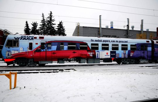 Пример брендирования электричек самоклеящейся пленкой представлен на фото: